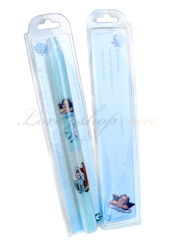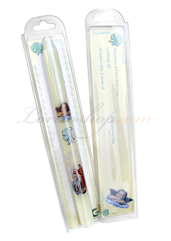 Candela per battesimo confezionata in un elegante astuccio con cartoncino ricordo personalizzabile con nome del bambino del parroco e della chiesa.