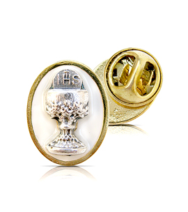 Spilla in metallo dorato smaltato per la Prima Comunione. Dimensioni 10x14 mm.